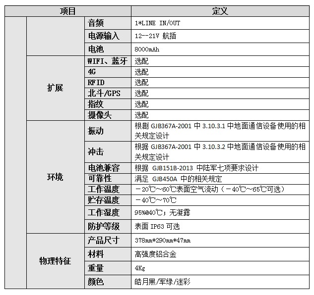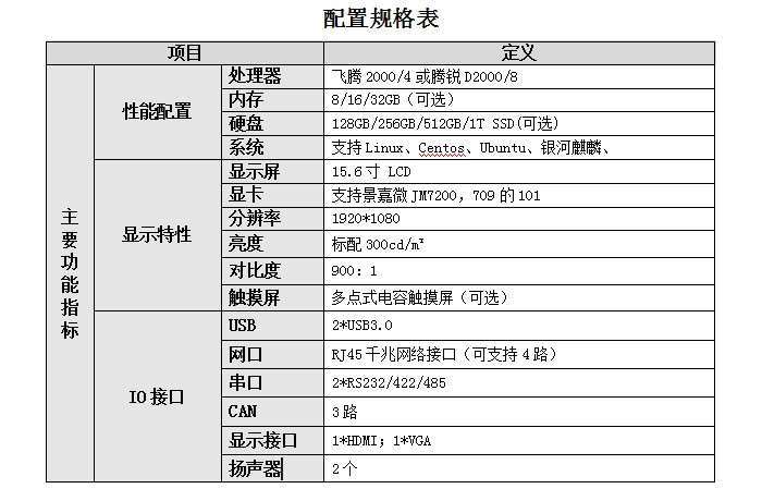 便攜式加固型計(jì)算機(jī),處理器飛騰2000/4或騰銳D2000/8,內(nèi)存8/16/32GB(可選),硬盤128GB/256GB/512GB/1T SSD(可選),系統(tǒng)支持Linux、Centos、Ubuntu、銀河麒麟。顯示屏15.6寸 LCD,顯卡支持景嘉微JM7200,709的101,分辨率1920*1080,亮度標(biāo)配300cd/m2,對(duì)比度900:1,觸摸屏多點(diǎn)式電容觸摸屏(可選)。