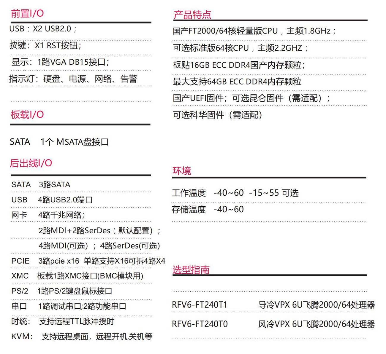 采用國(guó)產(chǎn)飛騰處理器遵從 VITA65 規(guī)范支持貼裝不同規(guī)格 FT2000/64 CPU 最大支持64GB ECC DDR4內(nèi)存4路千兆 以太網(wǎng)絡(luò)支持TTL脈沖時(shí)統(tǒng)。具備豐富的外圍接口;設(shè)計(jì)了 高效的散熱系統(tǒng),可顯著提高處理器的浮點(diǎn)運(yùn)算性能,以 太網(wǎng)、PCIe、支持高帶寬數(shù)據(jù)傳輸,滿足視頻采集與處理、雷達(dá)和聲吶等應(yīng)用對(duì)高速數(shù)據(jù)傳輸?shù)囊?。滿足無(wú)人機(jī)、雷達(dá)、水面艦艇等軍工領(lǐng)域。
