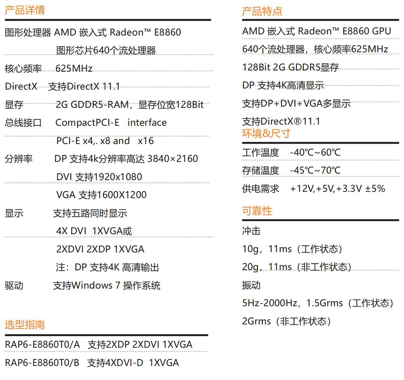 一 款 CPCI-E 6U 架 構 獨 立 顯 卡 , 采 用 AMD 嵌 入 式 Radeon E8860圖形芯片,具有 640個流處理器,核心頻率625MHz 128Bit 2G GDDR5顯存 支持DirectX?11。支持4K 高清顯示;具有出色多顯示輸出接口、(支持DP VGA 以及DVI接口輸出)該顯卡具有功耗可 以調節(jié)的特點,可在環(huán)境惡劣的環(huán)境工作。該產品有良好計算和圖形 性能,適合高性能的應用場合。在相同功率范圍內, GPU的性能是上 一代E6760的兩倍多,其單點精度浮點性能提高了33%,達到768 GFLOPS,這使得AMD E8860 GPU能夠應對最復雜的并行應用程 序,比如地形繪圖、雷達導航和氣象繪圖,面部和手勢識別,以及生 物識別分析等。