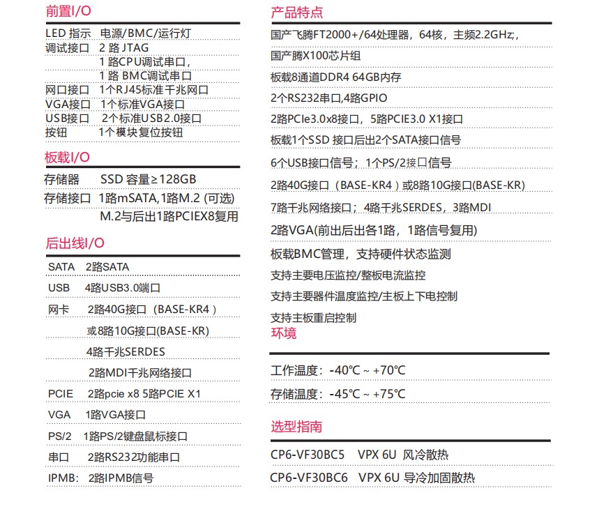 模塊基于飛騰FT2000+/64處理器,選用飛騰自 研X100橋片。模塊支持100%國產(chǎn)化設(shè)計。符合 Vita65規(guī)范,6U VPX規(guī)格。具備豐富的外圍接口; 設(shè)計了高效的散熱系統(tǒng),可顯著提高處理器的浮點運 算性能,以太網(wǎng)、PCIe、支持帶寬數(shù)據(jù)傳輸,是一款 滿足視頻采集與處理、雷達(dá)和聲吶等應(yīng)用對高速數(shù)據(jù) 傳輸?shù)囊?。滿足無人機、裝甲車、水面艦艇等軍工領(lǐng)域。